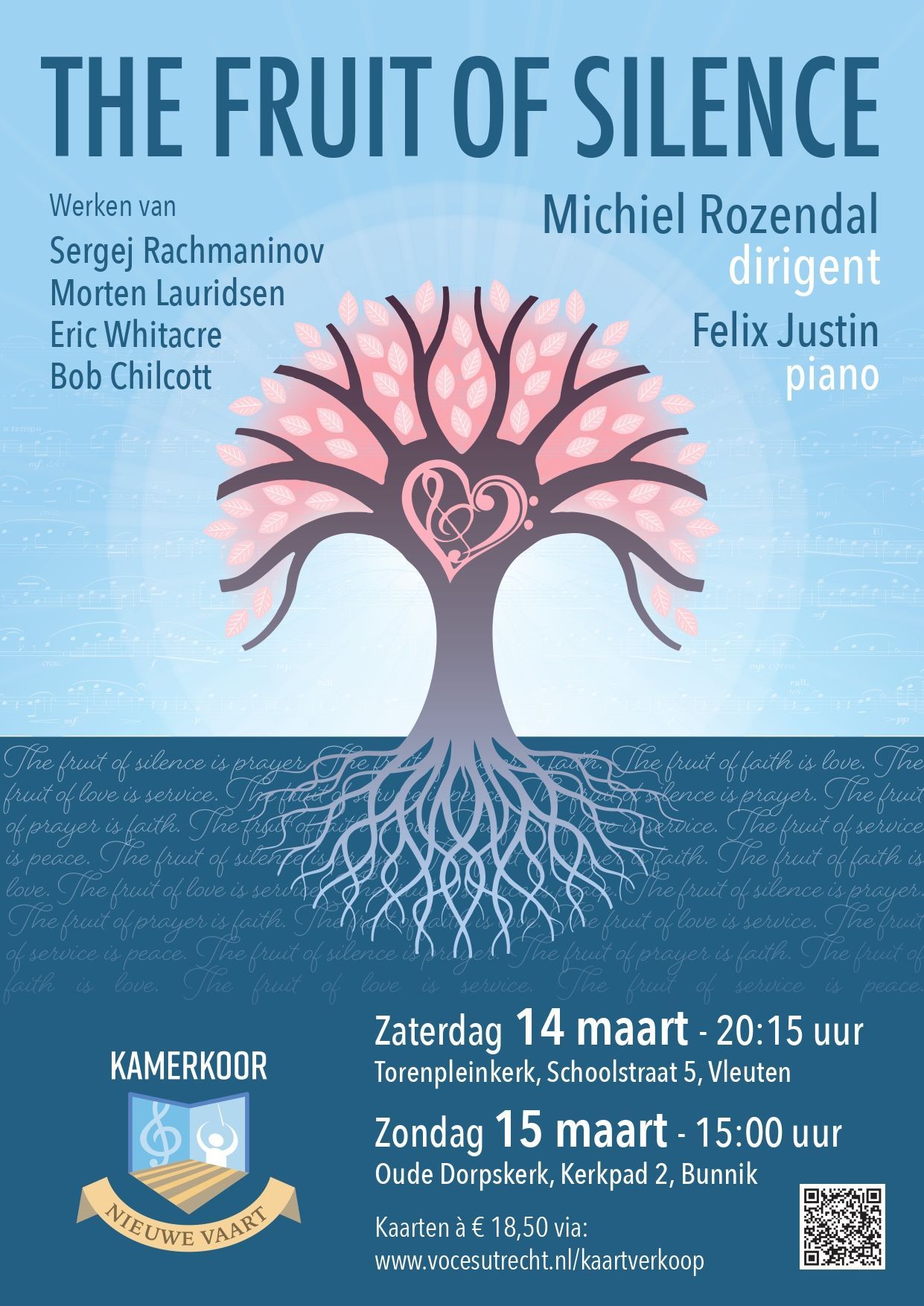 Op zaterdagavond 14 maart en zondagmiddag 15 maart geeft Kamerkoor Nieuwe Vaart twee concerten onder de titel ‘The Fruit of Silence’. Het koor staat onder leiding van dirigent Michiel Rozendal en wordt begeleid door pianist Felix Justin.